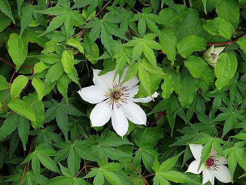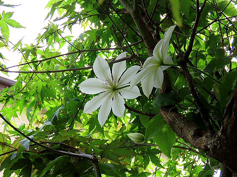 モミジの若葉に隠れて全体が見えませんが20輪ほど花を咲かせました。