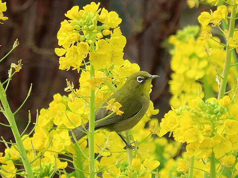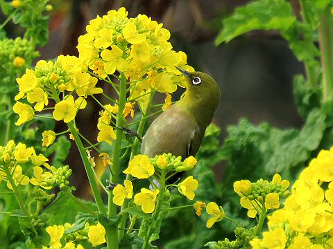 メジロは雑食性で甘いものが大好きなので、蜜を吸うために菜の花にもやってきます。