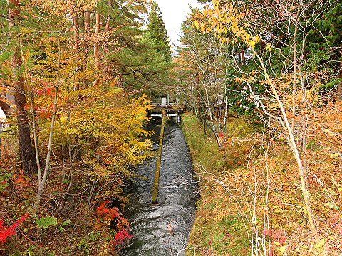 馬堀川を跨いで北口本宮冨士浅間神社の境内を横切る水路。