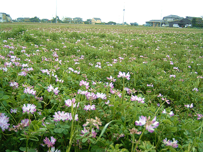 -(116 KB)今年もレンゲソウが咲き始めました。陽だまりの中、車窓に広がる田園風景。いつまでも見飽きませんね。つい、シャッターを切ってしまいました。