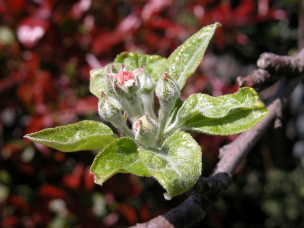 そのようなわけで、まずはご挨拶代わりに、我が家の庭先からリンゴ(フジ)の新芽です