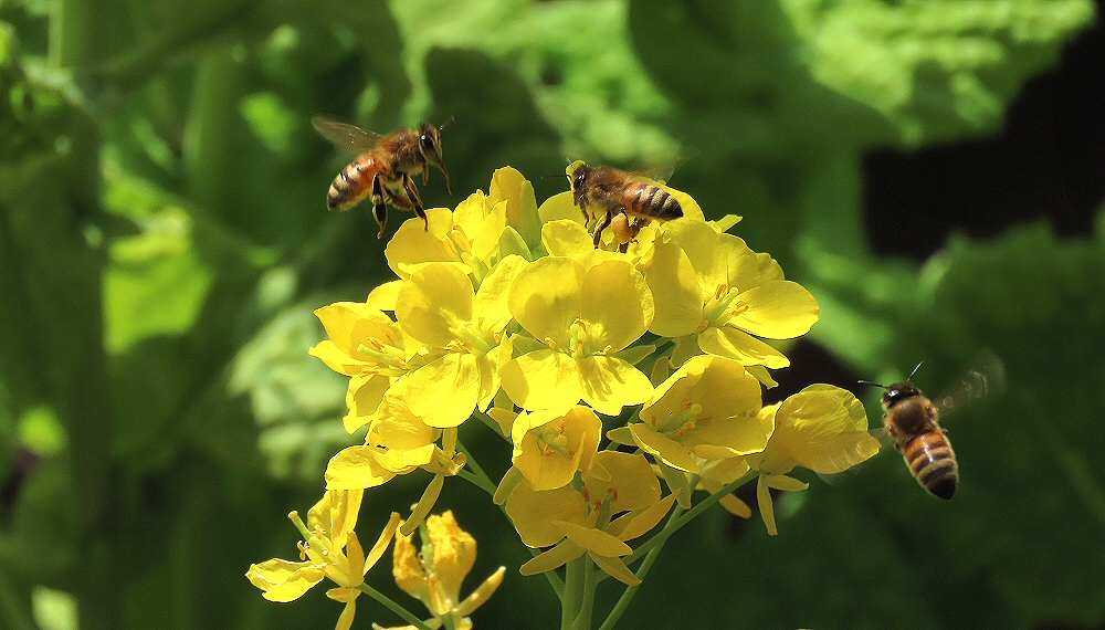 菜の花にセイヨウ蜜蜂がたくさんやって来て賑やかです。