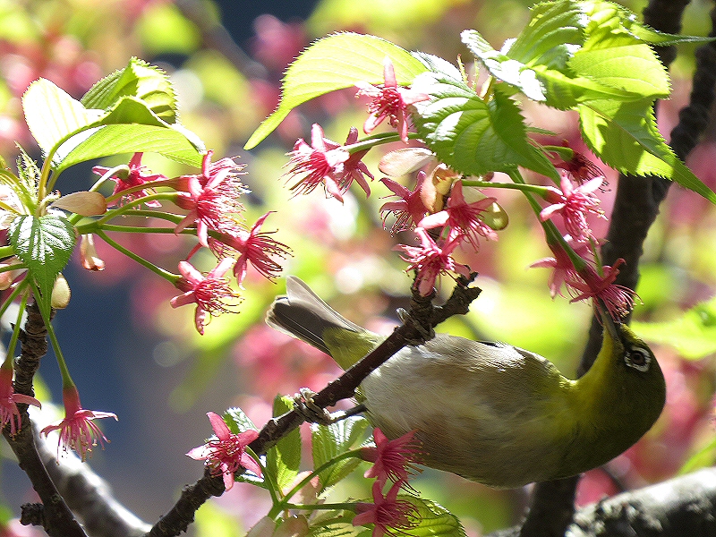 盛んに飛び回って吸蜜をするメジロ。