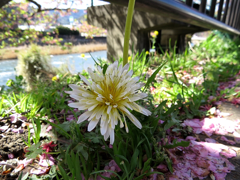 堤防を散策していると足元にシロバナタンポポが咲いていました。
